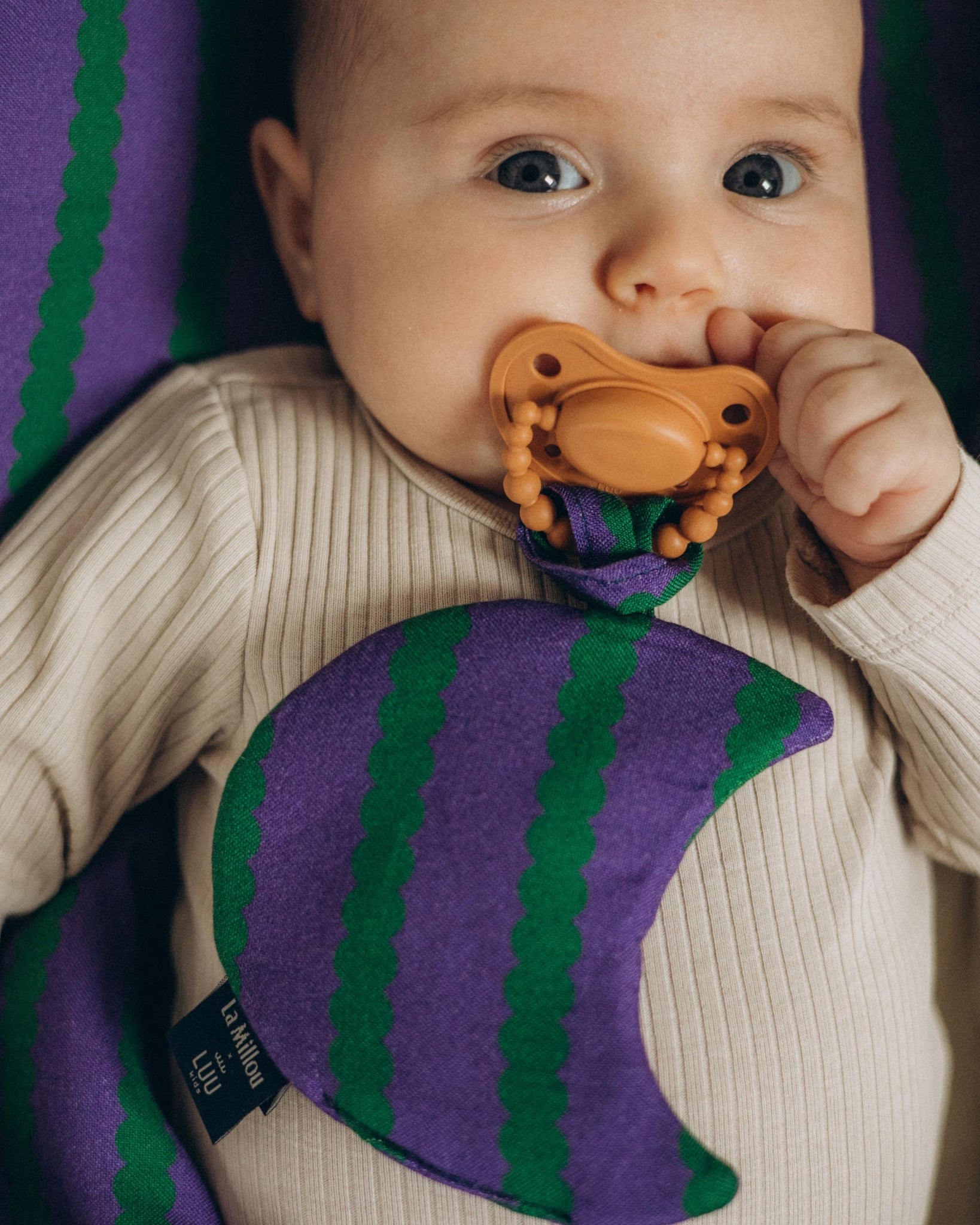 Przywieszka umożliwia łatwe przypięcie smoczka lub gryzaka, pomagając utrzymać je w czystości i zawsze pod ręką.